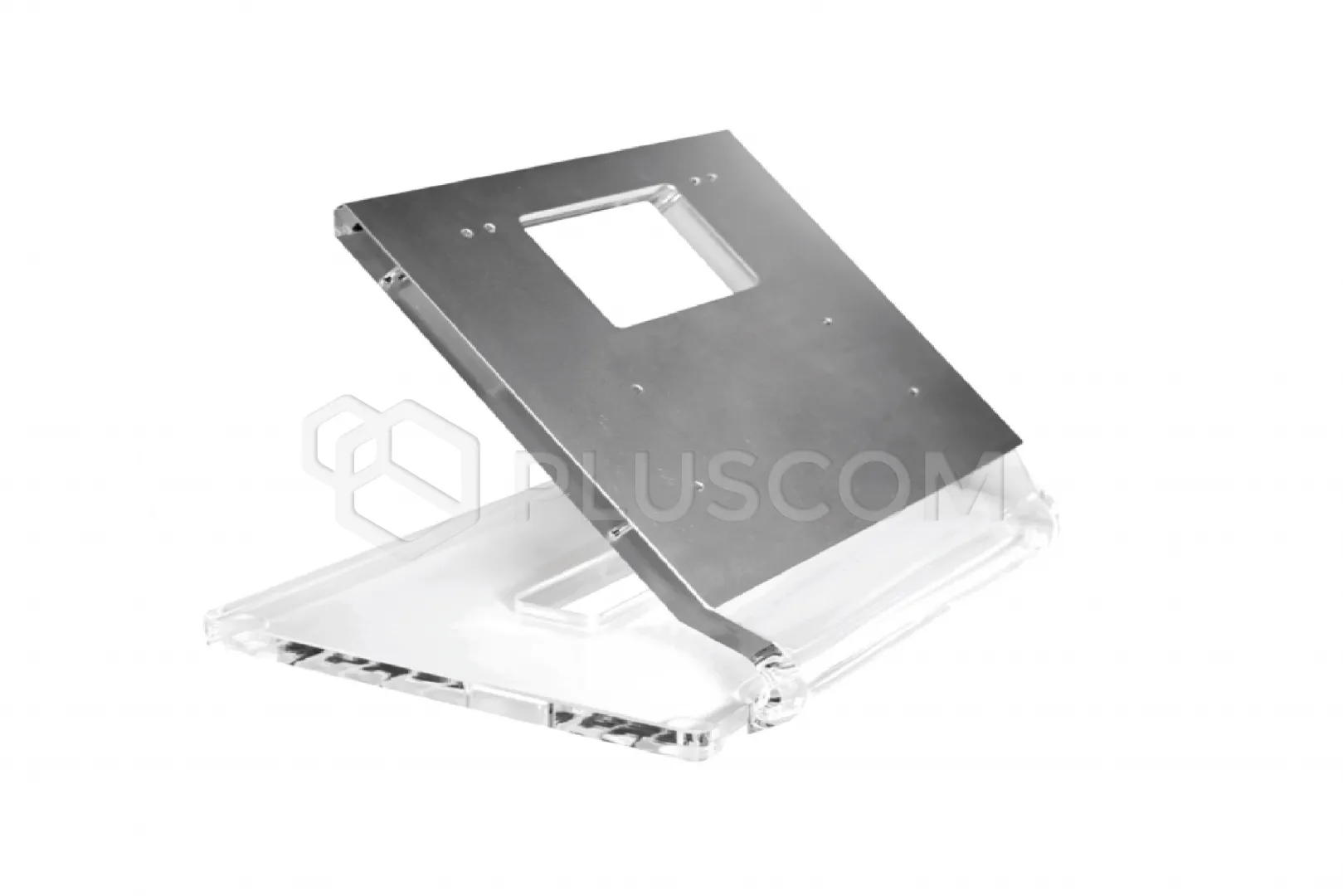Wspornik stołowy dla paneli wewnętrznych z serii Futura. Podstawka z pleksiglasu o grubości 10 mm, dostarczana razem z białym przewodem RJ45 i pokrywą strefy listwy zaciskowej z płytką z PMMA w kolorze szarym metalizowanym.