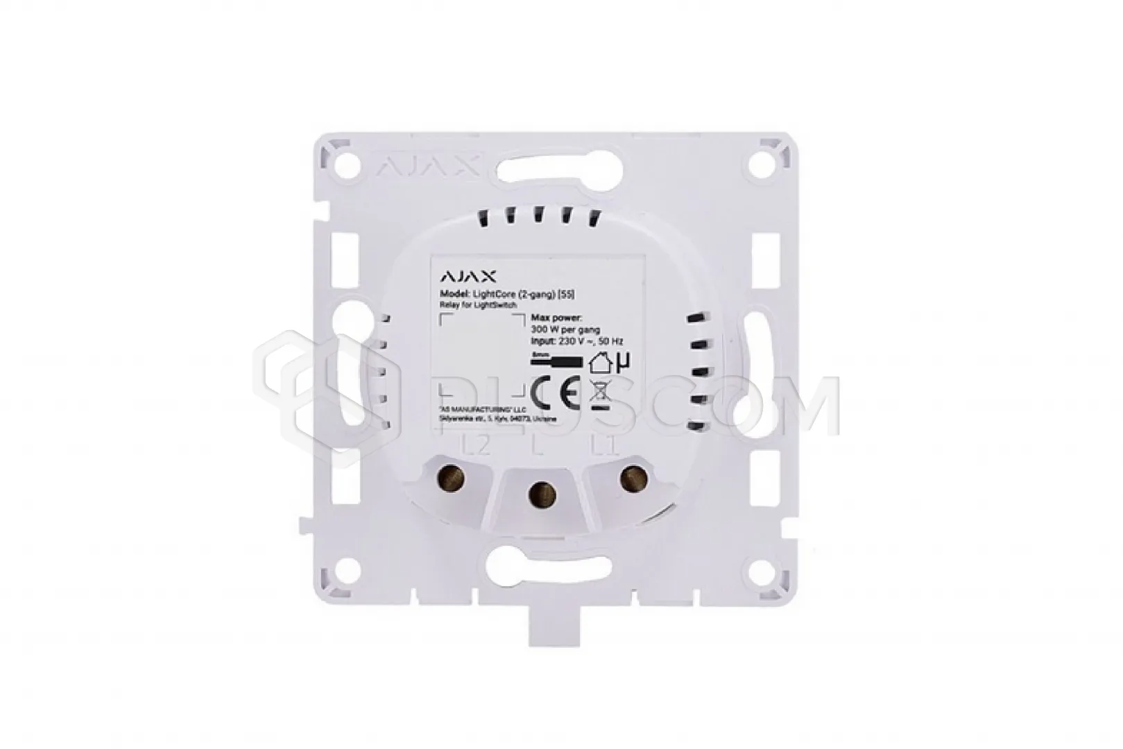 LightCore ist ein Relais für Einfachschalter (1-fach), Doppelschalter (2-fach) oder Treppenschalter (2-Wege) des Ajax LightSwitch-Systems. Der Schalter kann Geräte mit einer Leistung von 5 bis 600 W steuern.