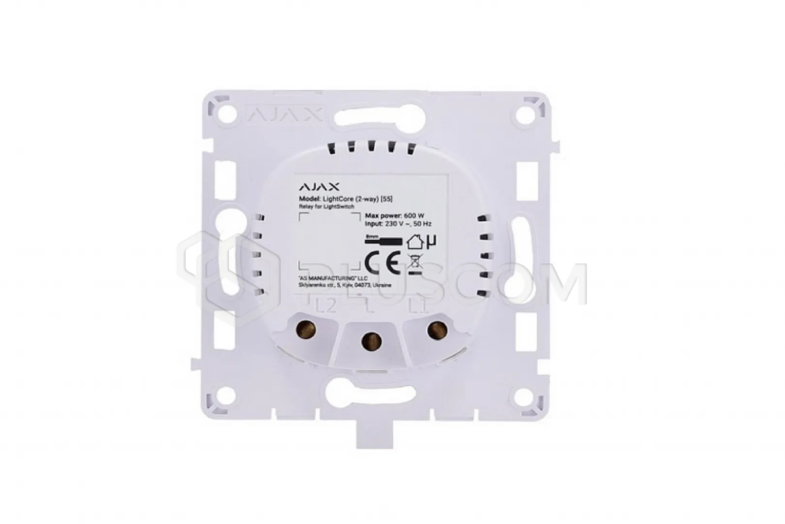 LightCore ist ein Relais für Ein-Tasten-Schalter (1-fach), Zwei-Tasten-Schalter (2-fach) oder Treppenschalter (2-Wege) des Ajax LightSwitch-Systems. Der Schalter kann Geräte mit einer Leistung von 5 bis 600 W steuern.