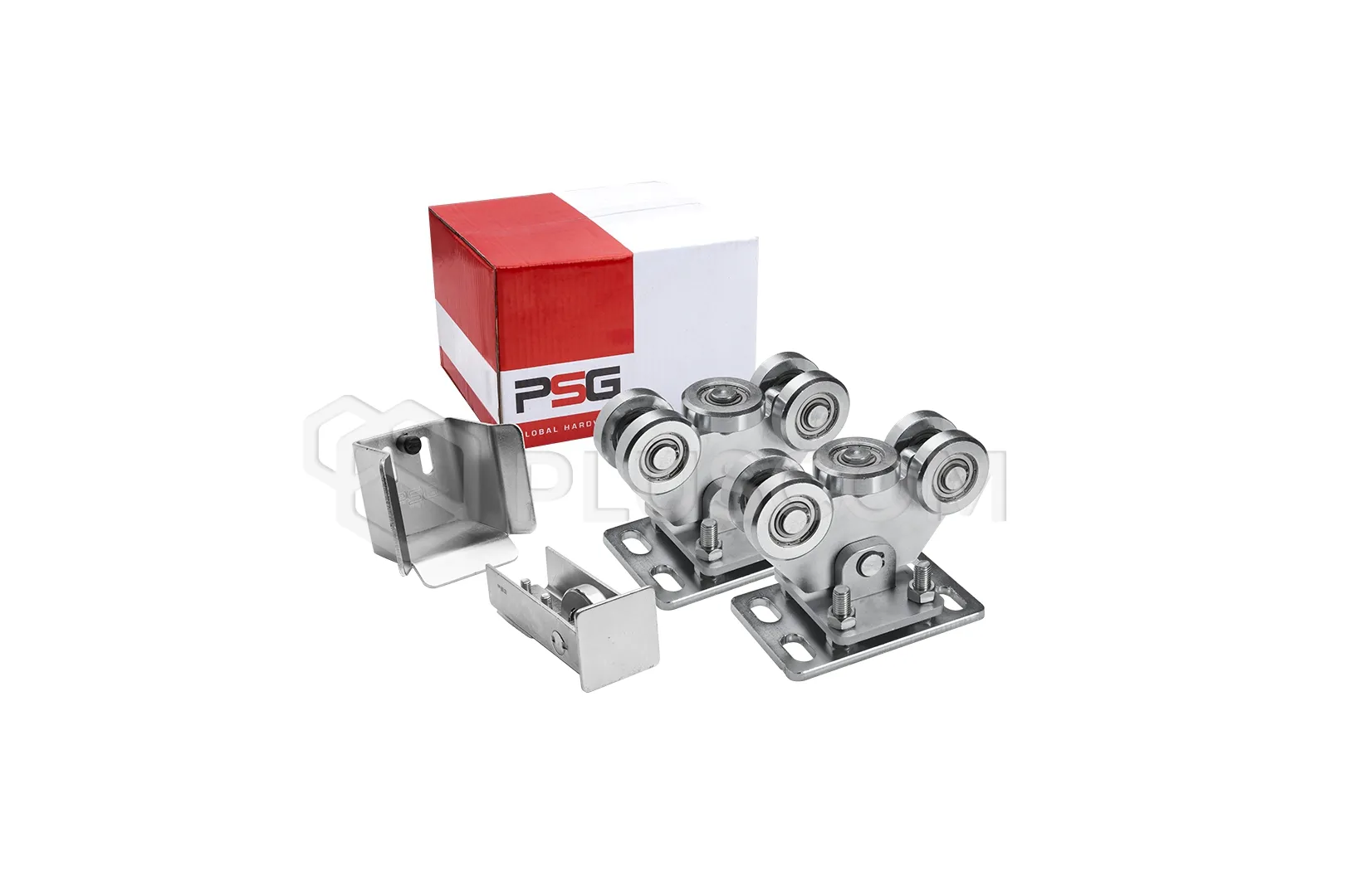 Fahrwagen 60.003 (zwei Stück) mit 5 Rollen aus Metall (darunter eine horizontale Rolle). Der Wagen ist schwenkbar und passt sich dem Schiebetor an (er ist über einen Bolzen mit dem Sockel verbunden). Er ist außerdem mit einer Höhenverstellung mittels Schrauben ausgestattet. Er ist für Schienen mit den Maßen 80 x 80 x 5 mm vorgesehen. Das Produkt ist verzinkt.