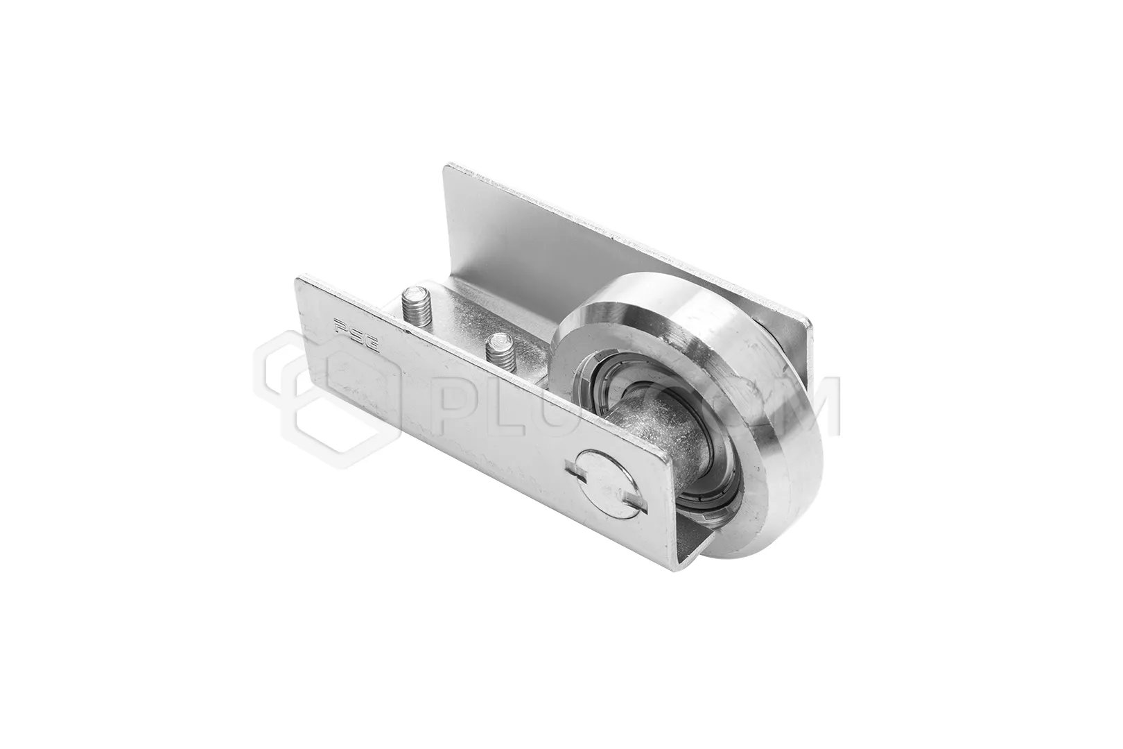 Auflaufrolle – Stahlelement, das am Anfang der Schiene eines selbsttragenden Schiebetors montiert wird. Die Rolle läuft in die am Pfosten befestigte Auflaufhalterung ein, wodurch das Gewicht des Tors auf mehrere Elemente verteilt und nach dem Schließen stabilisiert wird.