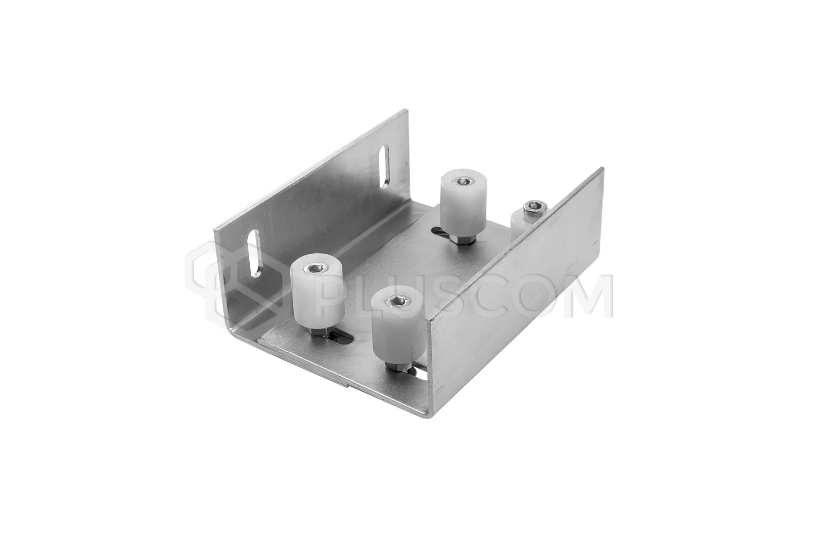 Stahlelement – Verstellbare obere Führung für selbsttragende und schienengeführte Schiebetore. Verfügt über vier Rollen aus weißem Kunststoff, die in speziellen Montageöffnungen (sogenannten Bohnen) verstellbar sind.