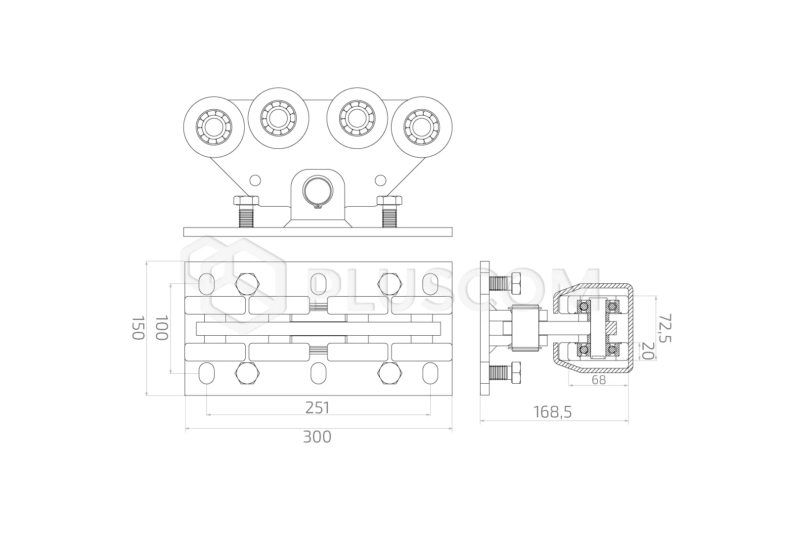 8-Rollen-Laufwagen für Schiebetore. Enthält eine Basis mit Befestigungslöchern, kompatibel mit der Schiene 6V.089.
