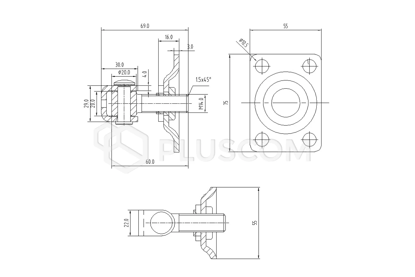 Verstellbares Stahlscharnier mit Schraube mit M14-Gewinde. Mit Montageplatte mit den Abmessungen 75x55 mm und einer Blechdicke von 3 mm. Die Verwendung dieses Scharniers ermöglicht eine einfache und schnelle Einstellung von Türen oder Flügeltoren nach der Montage mithilfe einer Einstellmutter.