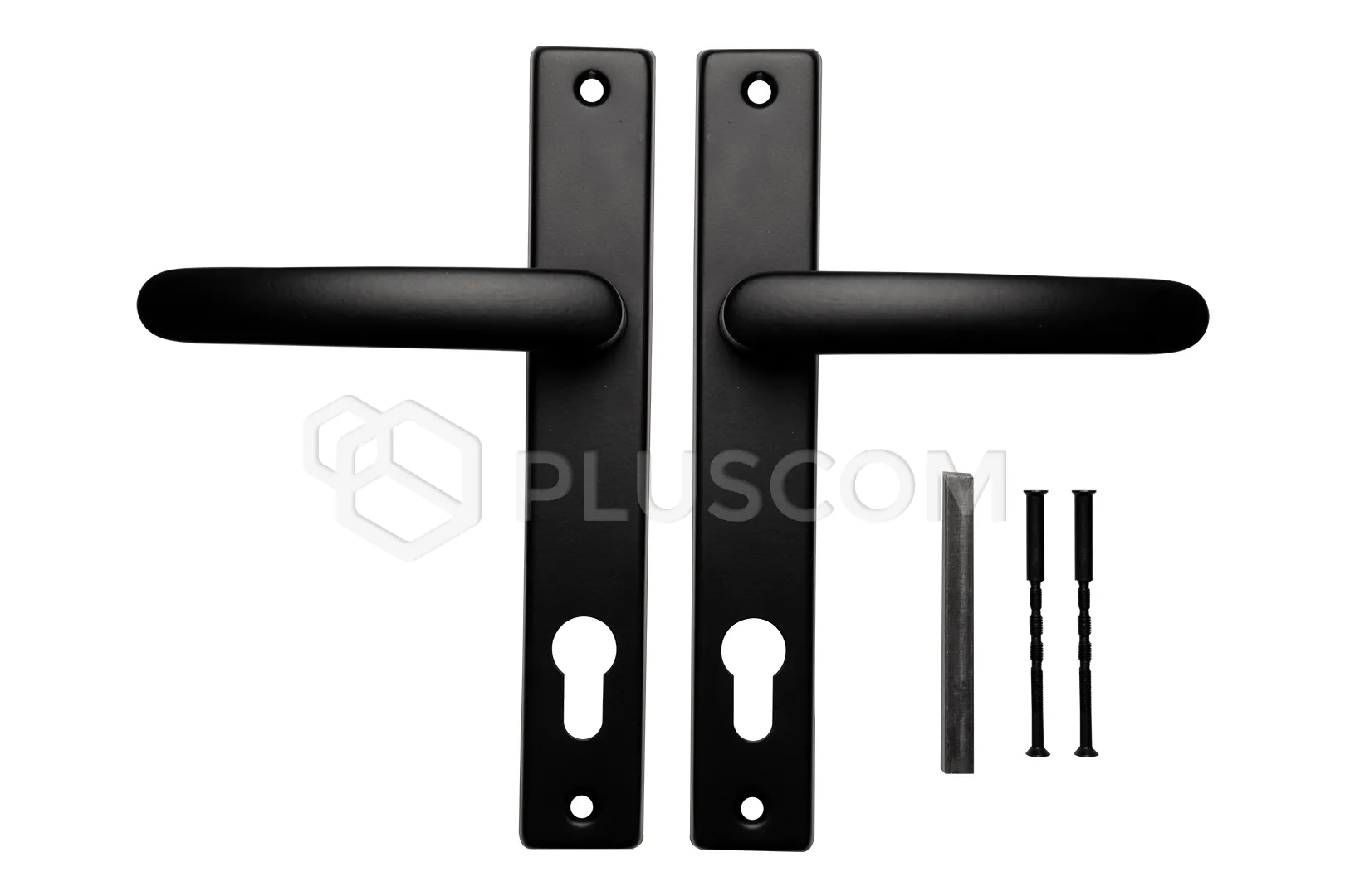 Das schmale Stahlschild in Schwarz passt perfekt zur Türklinke und bildet ein harmonisches und elegantes Set. Die Stahlkonstruktion des Schildes bietet zusätzlichen Schutz für das Schloss und unterstreicht die hohe Verarbeitungsqualität des gesamten Sets.