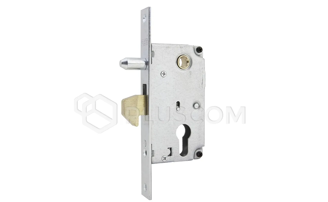 Massives Einsteckschloss, das in Einfahrtstoren, Türen und Schiebetoren verwendet wird. Der Haken verschwindet nicht im Schlossgehäuse, sondern wird mit einem Griff angehoben und mit einem Einsatz verriegelt.