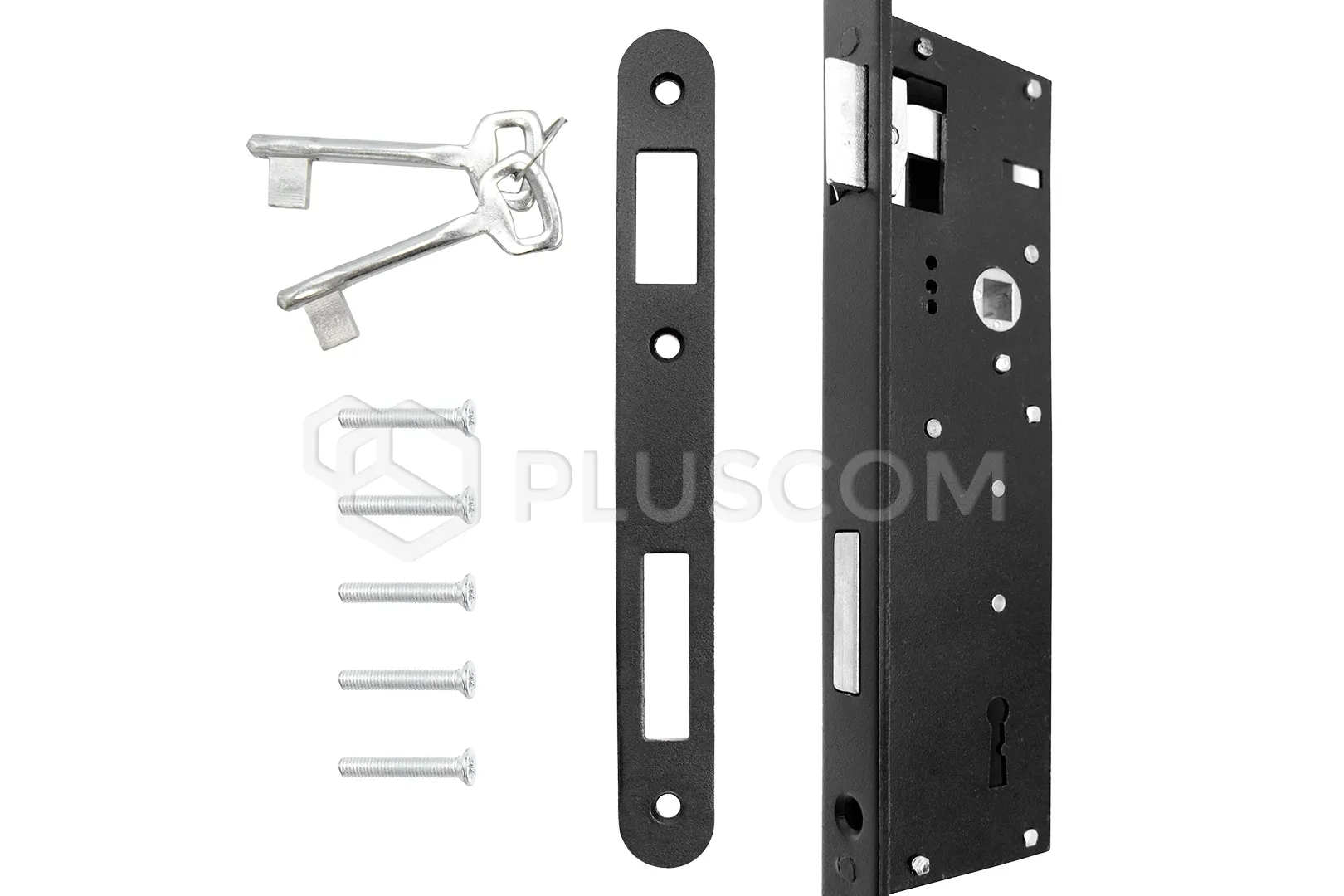 Einbauschloss mit Riegel und Hebel, für Türen und Tore. Das Schloss ist universell einsetzbar, da es sowohl an rechten als auch an linken Türen montiert werden kann. Die Falle kann ohne Demontage des Schlosses durch Abschrauben des Fallenkopfes verstellt werden.