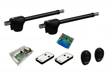 Das Aktuator-Set wird durch zwei 2-Kanal-Fernbedienungen E80/TX52R/2 mit einem festen Code von 433,92 MHz mit Kopierfunktion und einem Satz Infrarot-Fotozellen R90/F4ES ergänzt.
