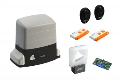Das Aktuator-Set wird ergänzt durch zwei 2-Kanal-Fernbedienungen T80/TX2 mit festem Code / variablem Code, die auf einer Frequenz von 433,92 MHz arbeiten, einem Satz Infrarot-Fotozellen R90/F2ES und einer LED-Signalleuchte FIFTHY/230/OR 230 V mit integrierter 433,92-MHz-Antenne, die die Reichweite der Fernbedienungen erhöht.
