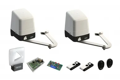 Antrieb mit bürstenlosem 24-V-Motor, mit Knickarm, für breite Pfosten für Flügeltore mit einer maximalen Flügellänge von 2,8 m. Er ist für sehr intensive Nutzung ausgelegt – 1900 Zyklen pro Tag. Die Öffnungszeit bis 90° beträgt 12-20 s.