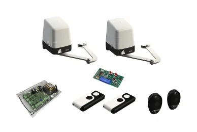 Das Antriebsset wird durch zwei 2-Kanal-Fernbedienungen SYNUS/2 mit festem Code/wechselndem Code, die auf der Frequenz 433,92 MHz arbeiten, und einen Satz Infrarot-Lichtschranken R90/F4ES ergänzt.