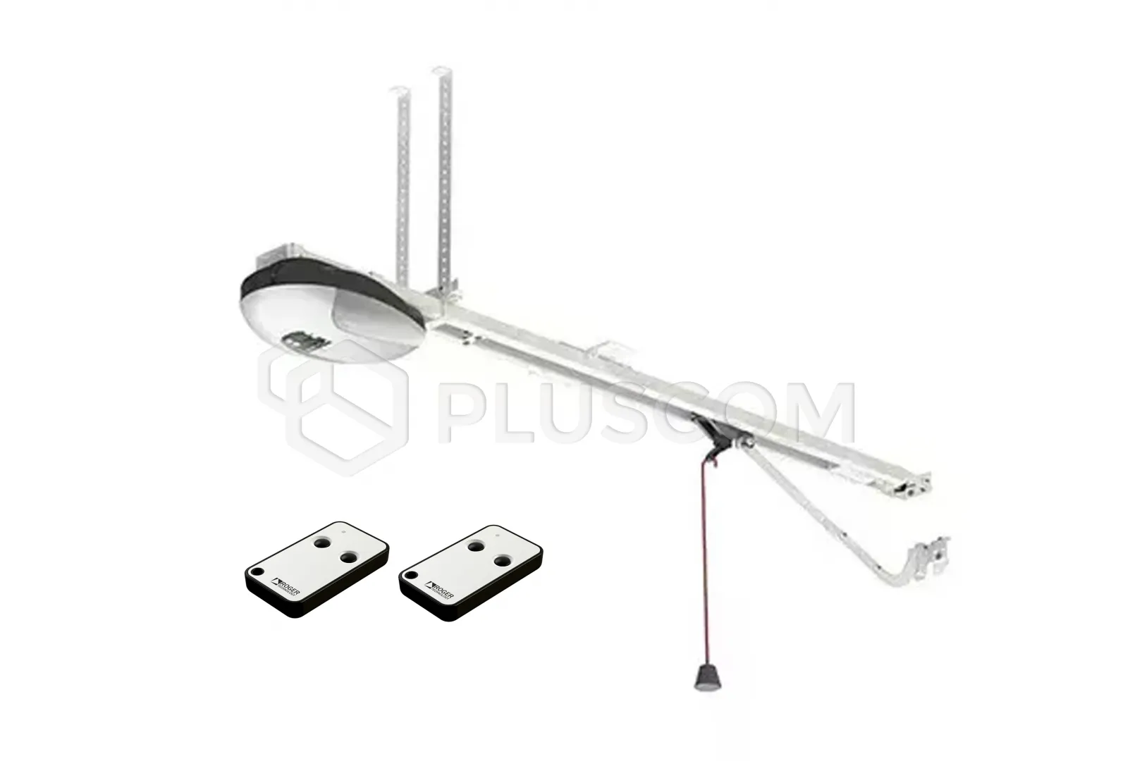 Der Antrieb C40/1000 verfügt über eine eingebaute Steuerzentrale C70/1CC mit integriertem Funkempfänger, Display und zusätzlicher LED-Beleuchtung sowie einen 24-V-Motor mit einer Leistung von 1000 N. Im Set enthalten sind eine einteilige Stahlführungsschiene mit verstärktem Riemen und zwei 2-Kanal-Fernbedienungen E80/TX52R/2.
