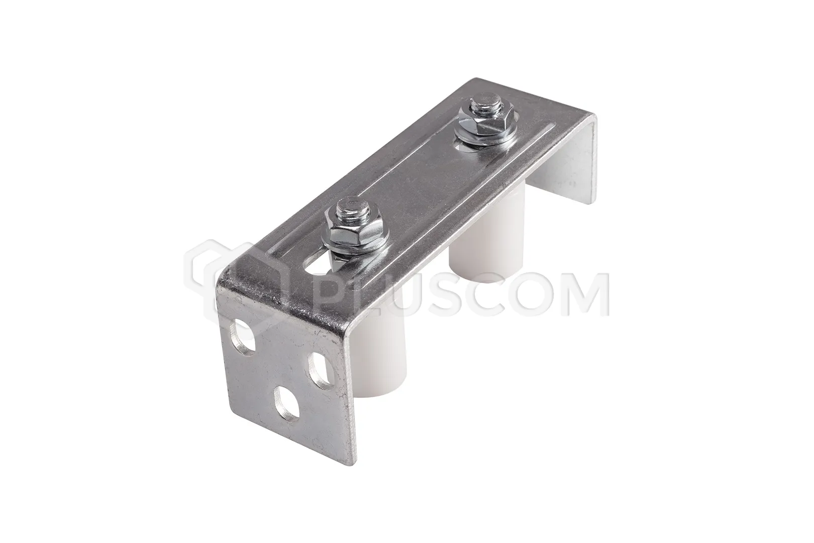 Upper guide for sliding gates, equipped with two white rollers made of plastic. The purpose of the guide rollers is to stabilize the gate, which allows for smooth sliding during opening and closing the gate.