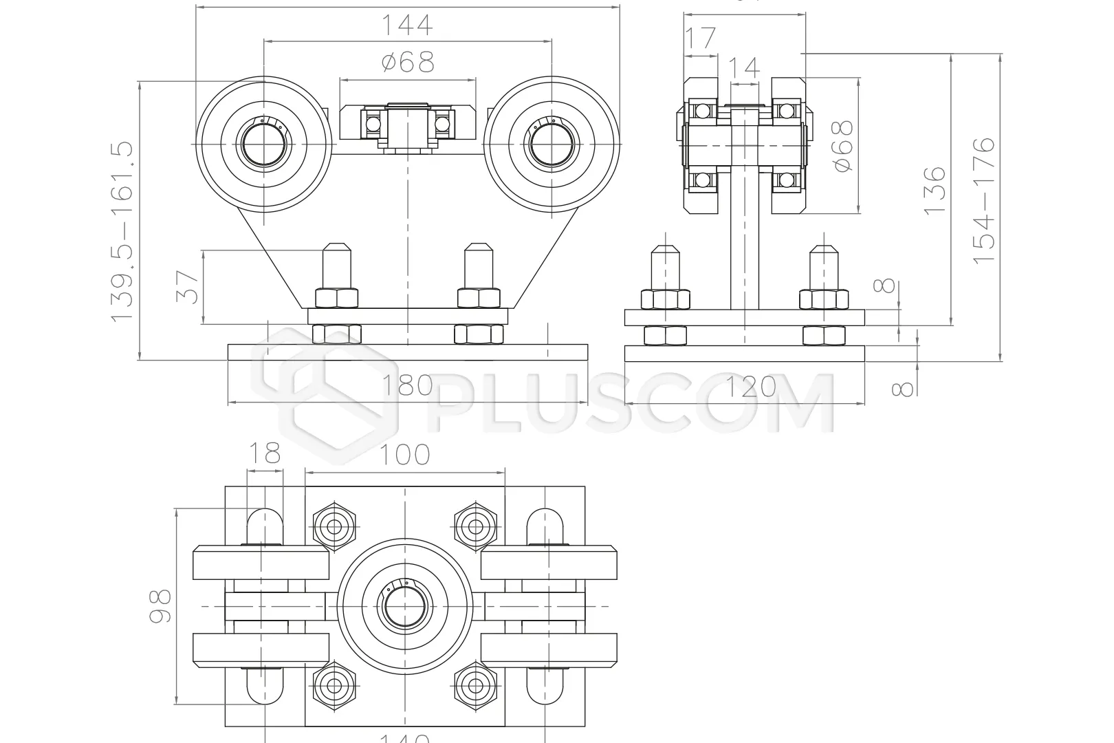 La hauteur du chariot se règle à l'aide de vis. Le produit est conçu pour un rail de 80 x 80 x 5 mm et est fixé de manière permanente à la base.