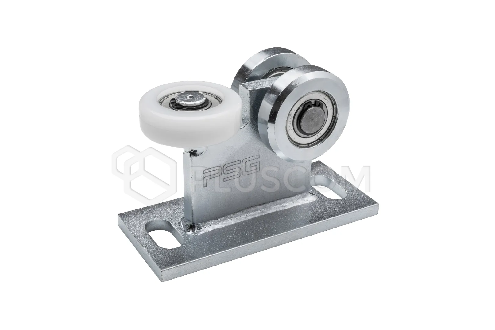 Chariot pour portes suspendues, avec trois roulettes (deux roulettes verticales en métal et une roulette horizontale en plastique). Le chariot est fixé de manière permanente à la base et est conçu pour un rail de 80x80x5 mm. Produit galvanisé.
