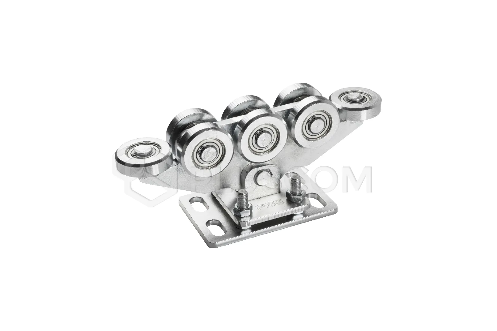 Chariot pour portes suspendues à huit roulettes. Le chariot est fixé de manière permanente à la base et conçu pour un rail de 80x80x5 mm.