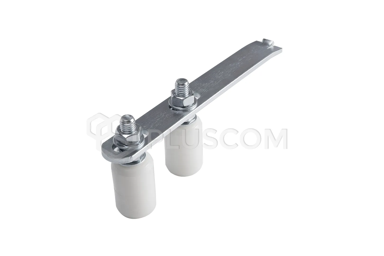 Élément en acier - Guidage supérieur réglable pour portes coulissantes autoportantes et sur rail. Comprend deux roulettes en plastique blanc réglables.