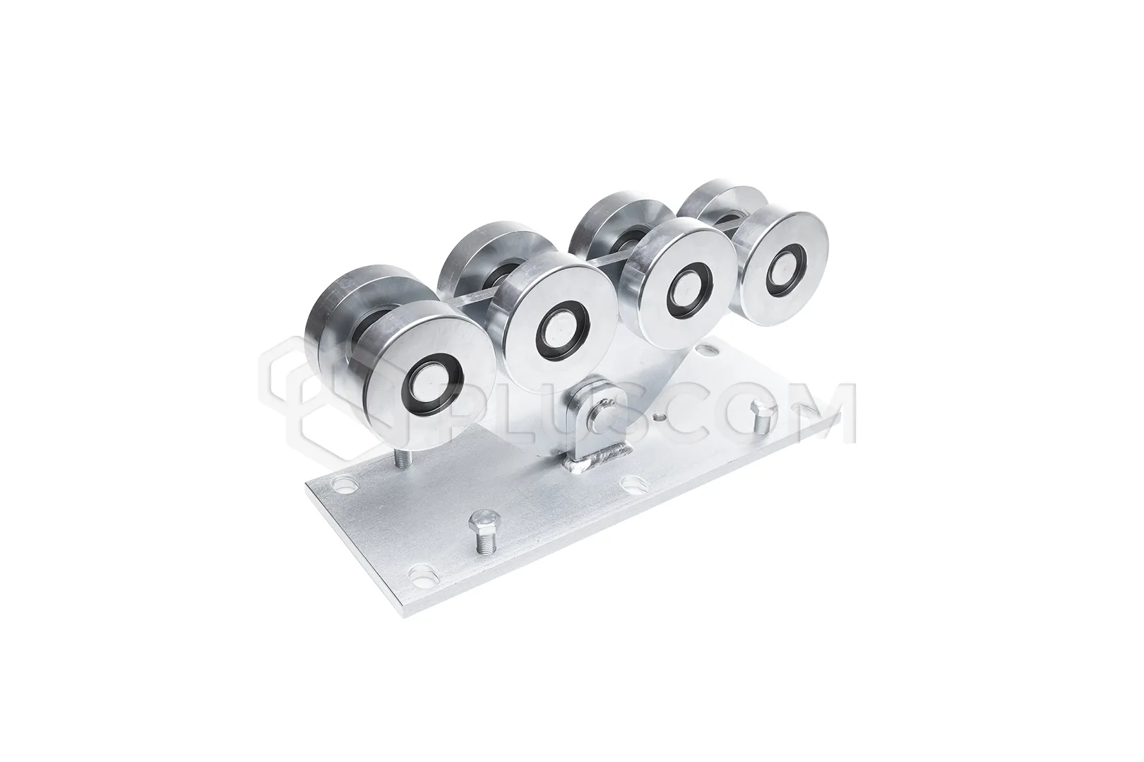 Chariot à 8 roulettes destiné aux portes coulissantes sur rail. Comprend une base avec des trous de montage, compatible avec le rail 6V.140.