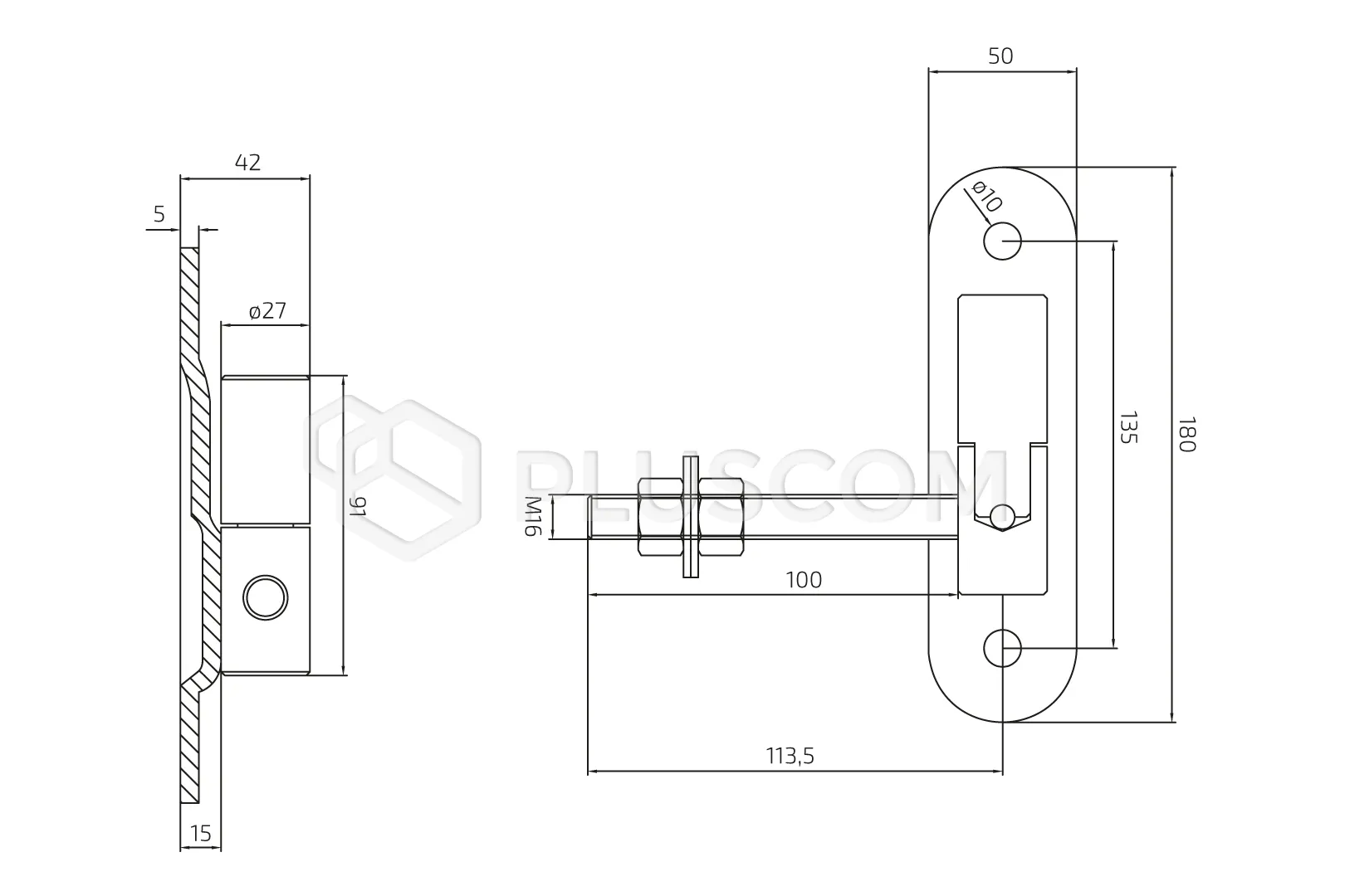 Le produit est équipé d'une plaque de 180 x 50 mm avec deux trous qui permettent de le visser. La charnière est galvanisée – elle convient à une utilisation en extérieur et offre une grande résistance à la corrosion.