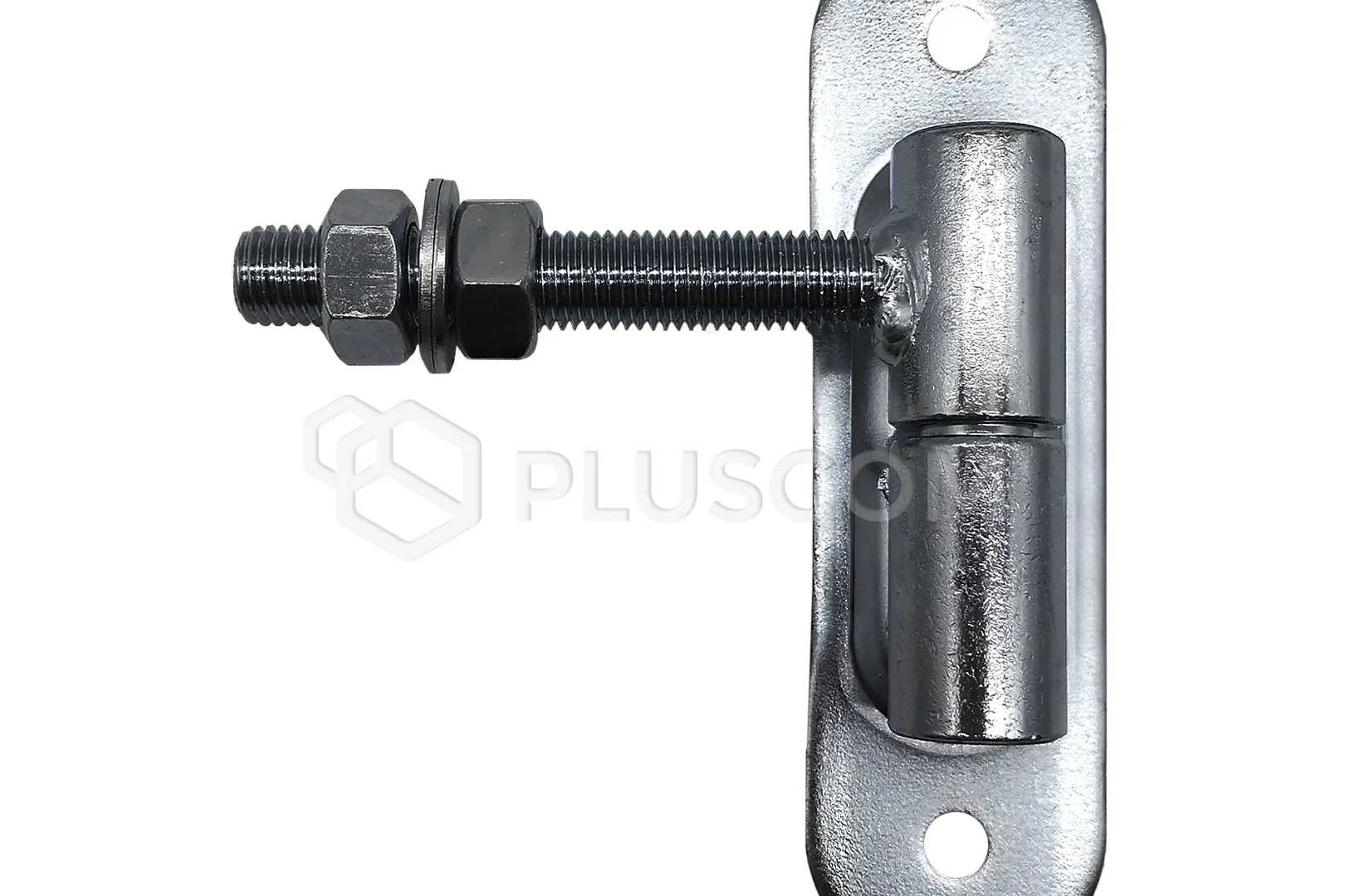 Charnière réglable en acier avec plaque et bille, destinée au montage d'un portillon. Diamètre de la charnière : 27 mm, filetage M16.