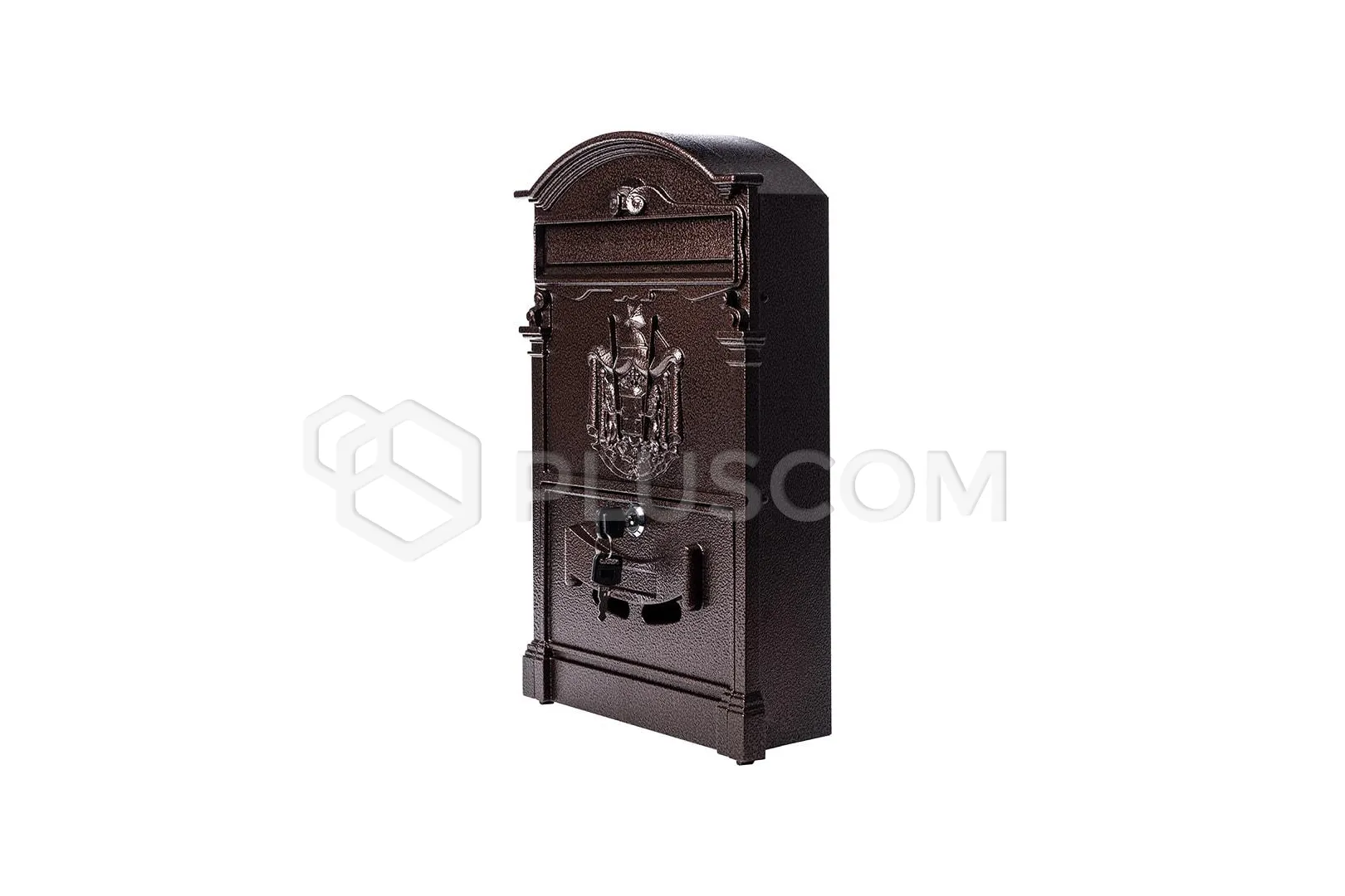 Boîte aux lettres multifonctionnelle aux dimensions 412 x 253 x 87 mm. Le corps est fabriqué en tôle d'acier hautement résistante à la corrosion, peinte par poudrage en couleur cuivre, tandis que la façade est en aluminium décoré.