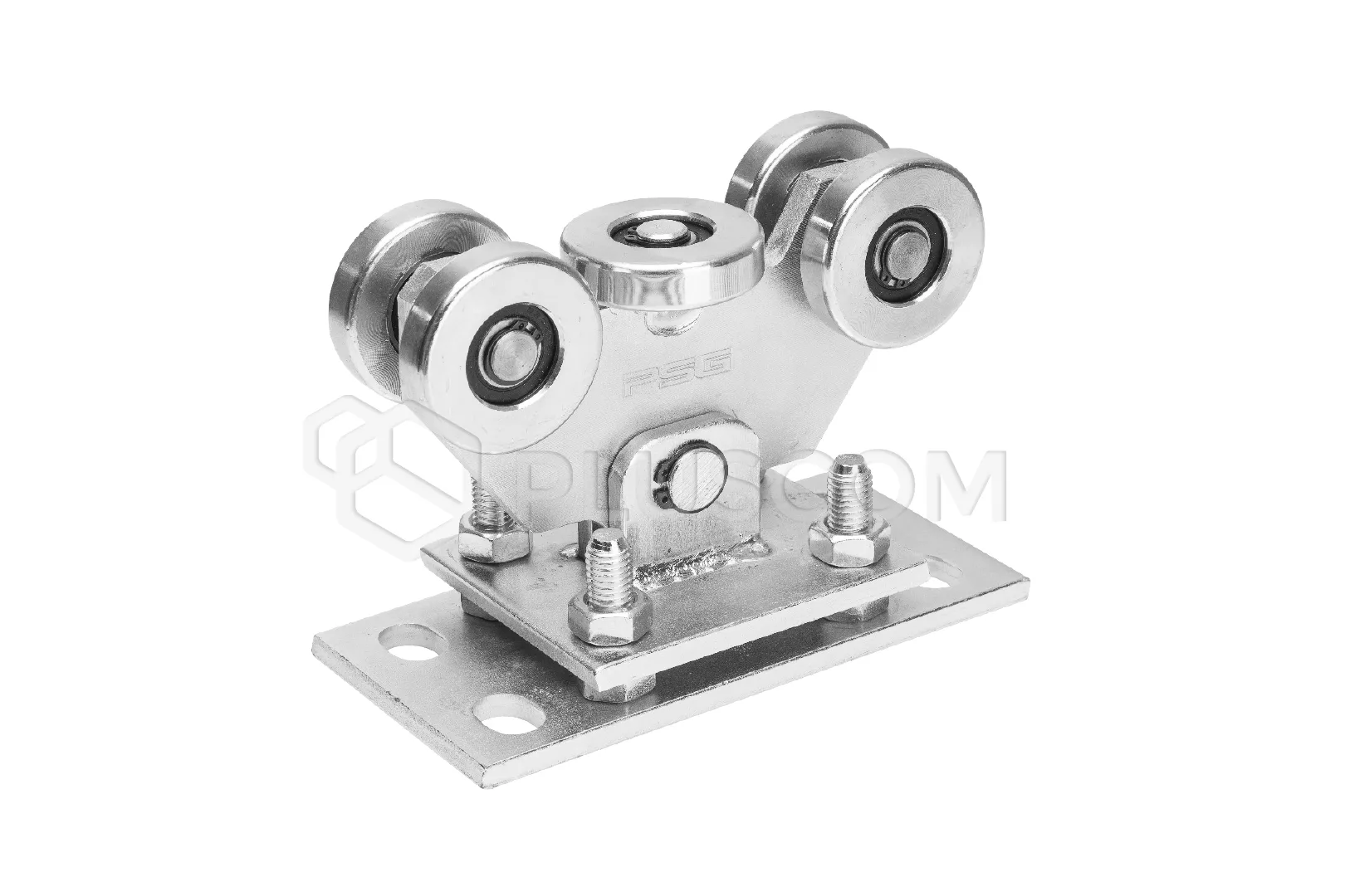 Carrello per cancelli scorrevoli autoportanti con 5 rulli in metallo (di cui uno orizzontale). Il carrello è oscillante e si adatta al cancello scorrevole (è collegato alla base tramite un perno).