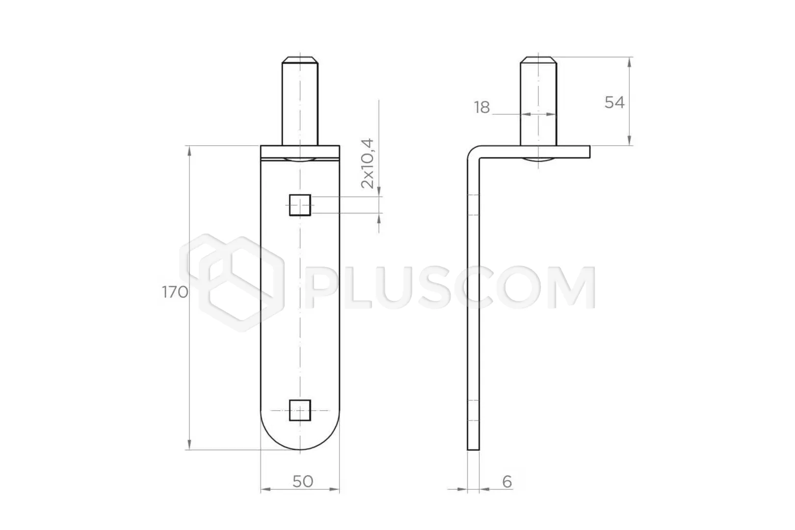 Perno (perno) per cerniera a nastro destinato a cancelli a battente. Dispone di fori di montaggio per il fissaggio con viti.