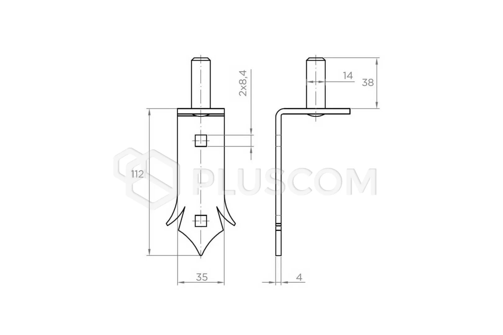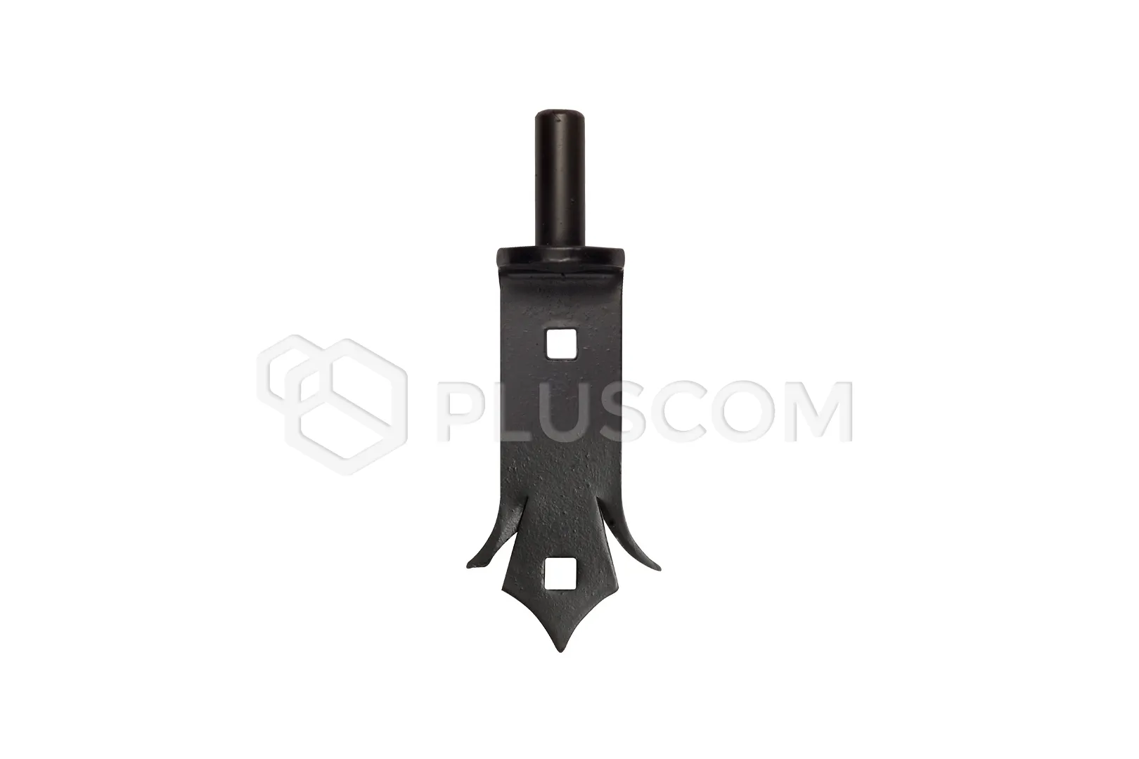 Perno (perno) per cerniera a nastro decorativa, destinata ai cancelli a battente. Dotato di fori di montaggio per il fissaggio con viti.
