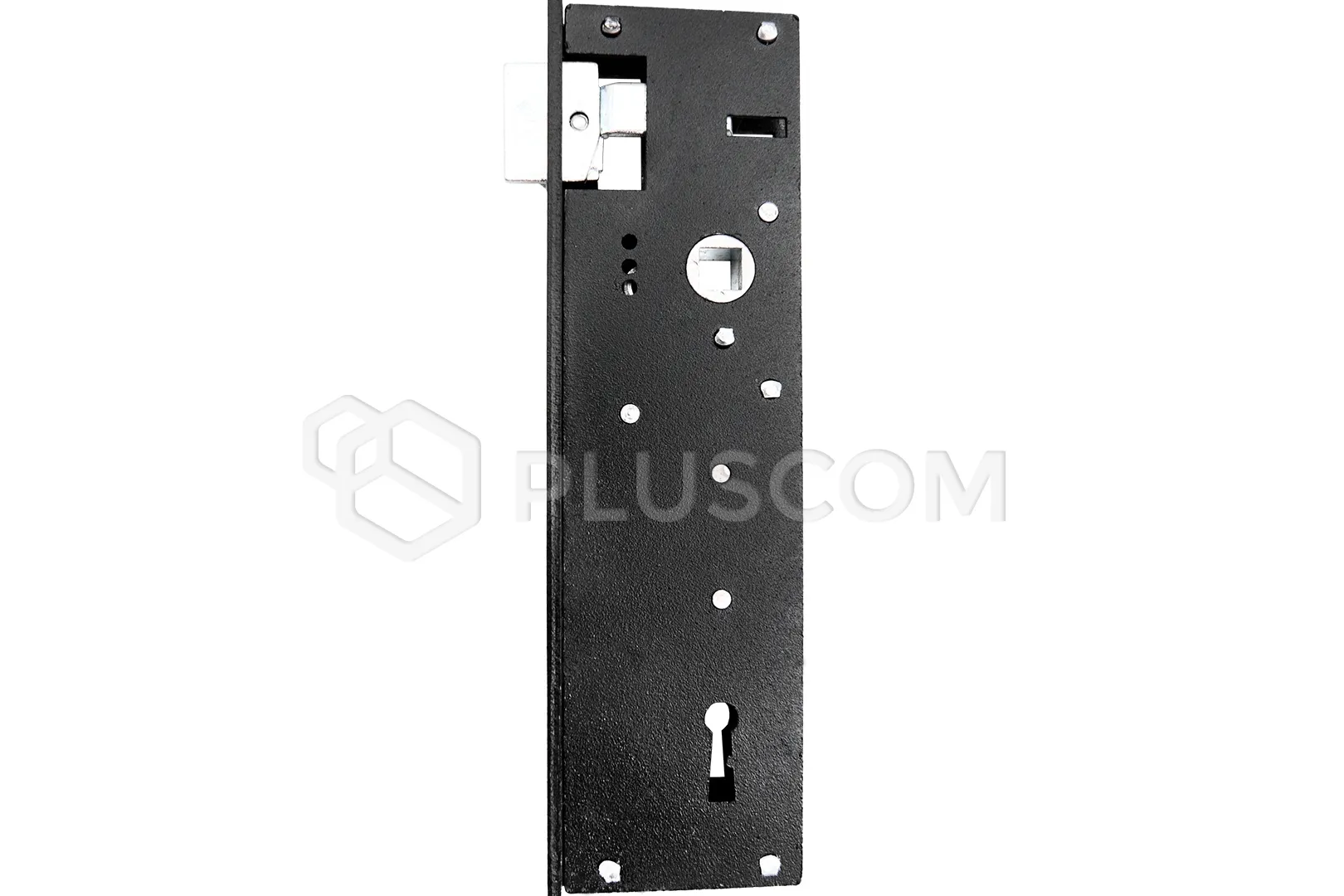 Serratura da infilare con catenaccio a scatto e leva, per porte e cancelli. La serratura è universale, poiché può essere montata su porte destre o sinistre. Il chiavistello può essere spostato senza smontare la serratura, svitando la testa del chiavistello.