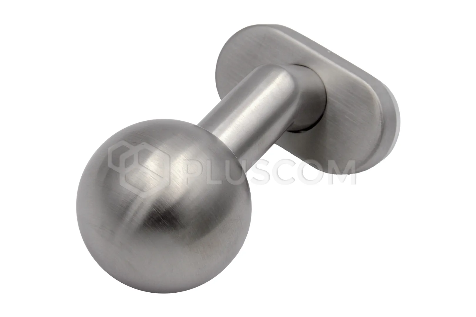 La maniglia, basata su una placca ovale, ha un'impugnatura a forma di sfera. L'estetica minimalista rende la maniglia perfetta per gli spazi moderni: è una finitura attraente per le porte di casa e dell'ufficio.