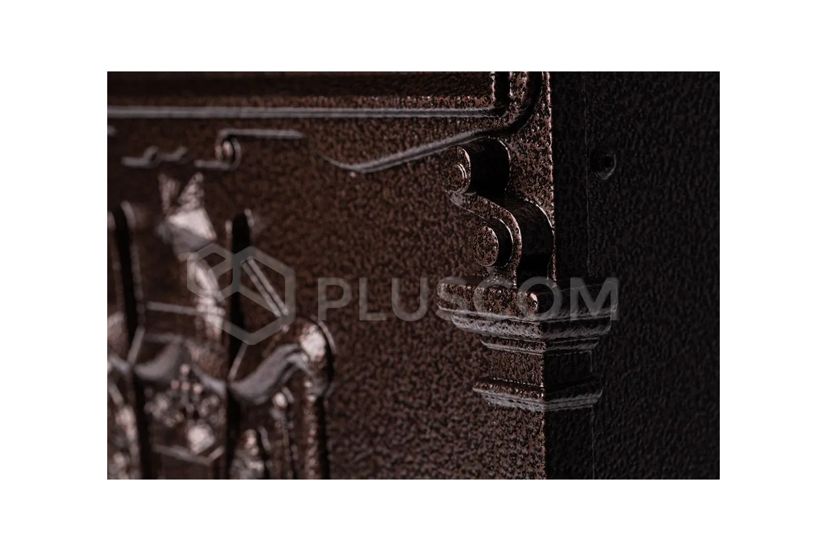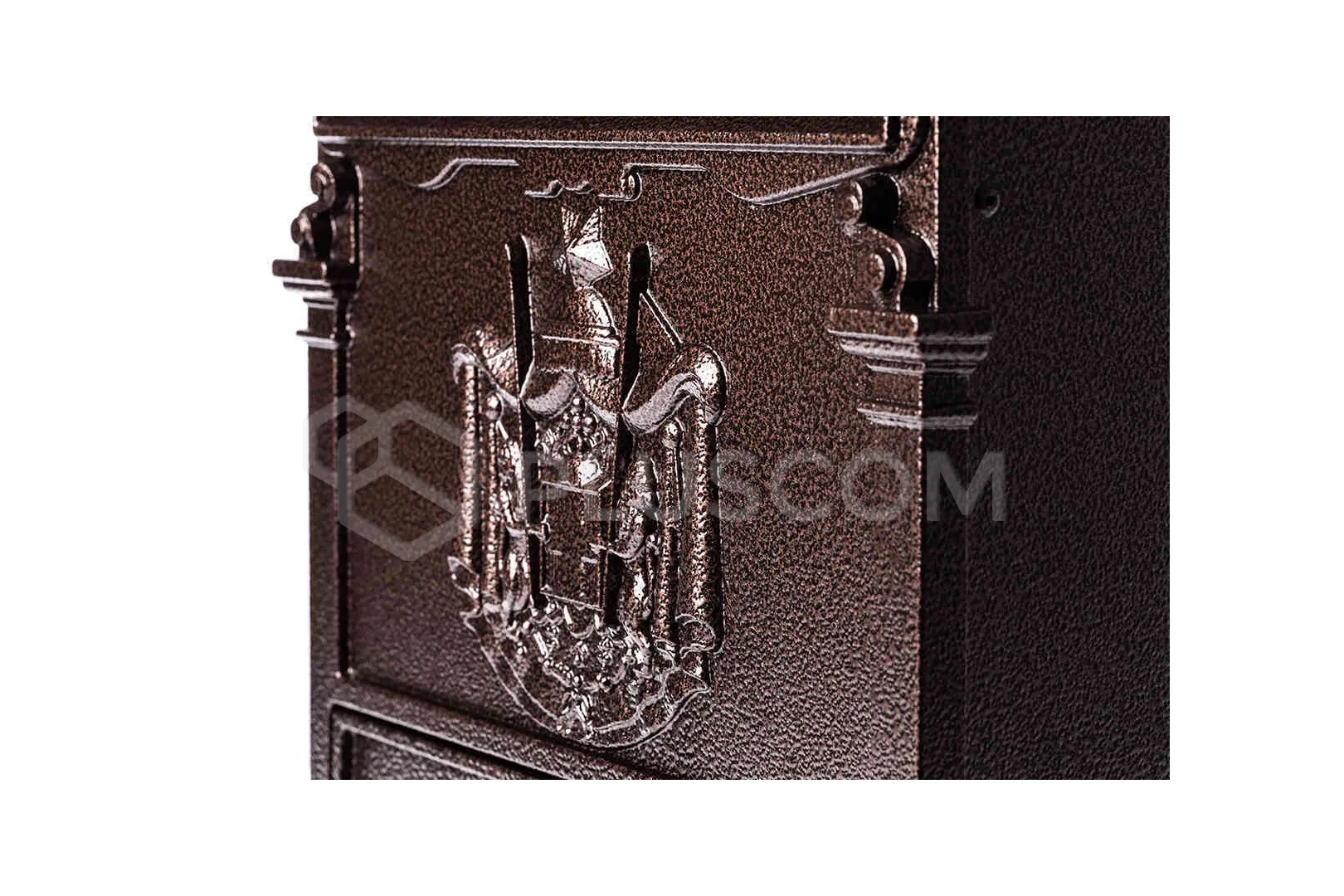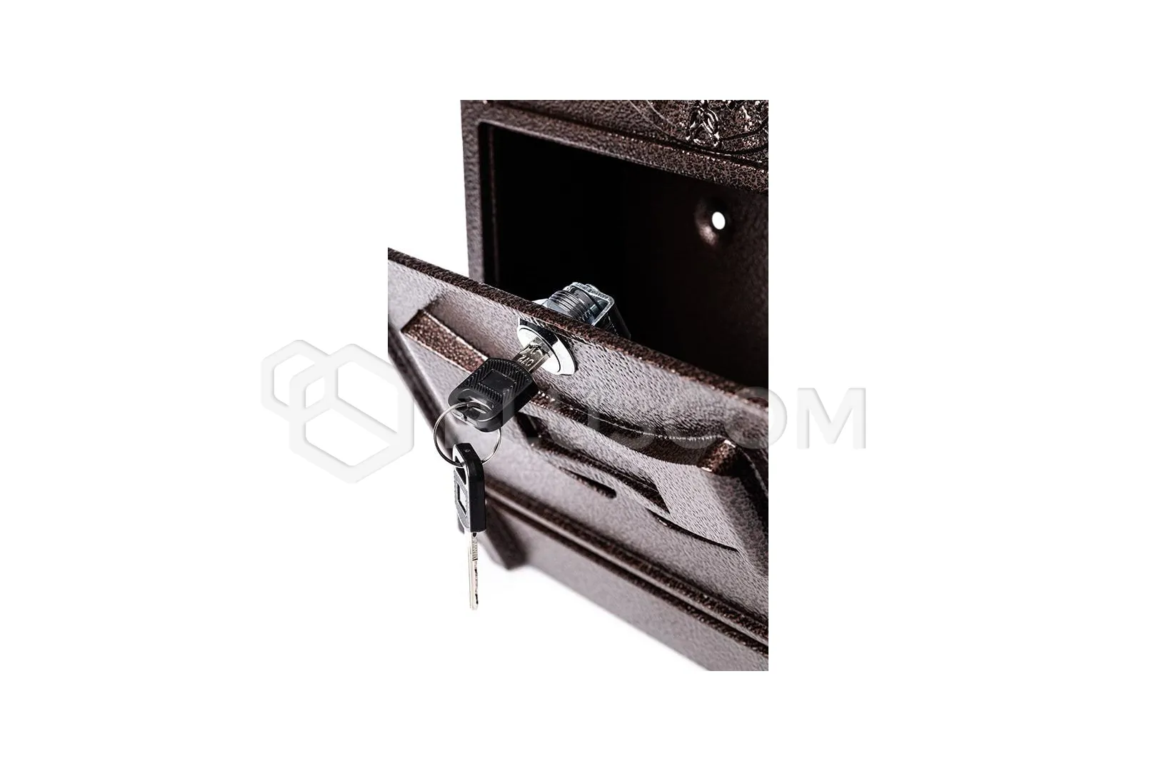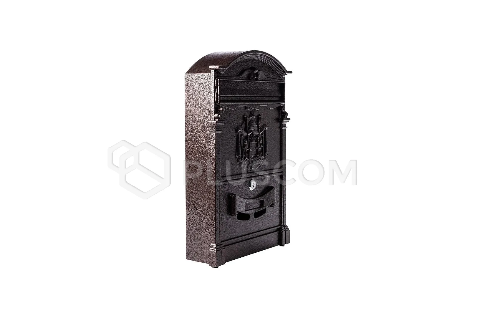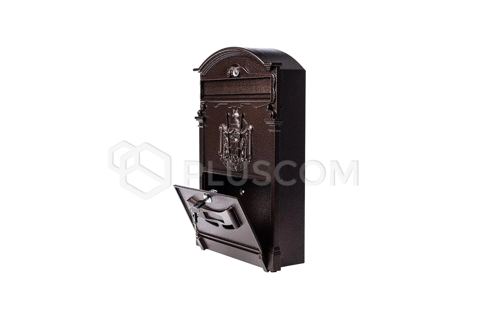 Cassetta postale multifunzionale con dimensioni 412 x 253 x 87 mm. Il corpo è realizzato in lamiera d'acciaio ad alta resistenza alla corrosione, verniciata a polvere in colore rame, mentre il frontale è in alluminio decorato.