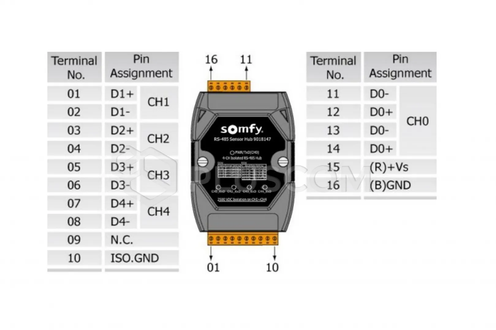 Somfy 9018147 Animeo ID+ Sensor hub è un dispositivo avanzato per la gestione della rete RS485 nei sistemi di automazione domestica e degli edifici. È un hub centrale che consente di collegare molti sensori e dispositivi diversi in un'unica rete coerente Hub RS485 a 4 canali: il dispositivo dispone di 4 canali di uscita RS485 indipendenti, ciascuno dotato di un controller dedicato. In questo modo è possibile collegare diversi dispositivi, come sensori di temperatura, umidità e movimento, oppure attuatori per cancelli e tapparelle.
