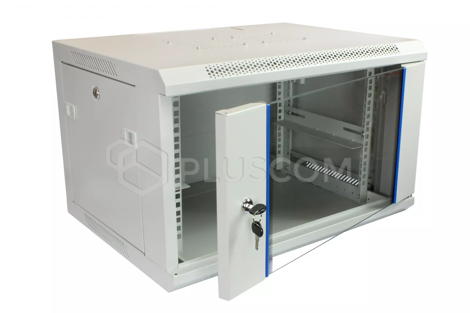 Szafa wisząca 19" 6U o głębokości 450mm wykonana z blachy stalowej o grubości 1,2mm malowanej proszkowo przeznaczona do zastosowań wewnątrz pomieszczeń. Przednie drzwi przeszklone (hartowane) wyposażone są w jednopunktowy zamek i mogą pełnić funkcję prawych lub lewych. Kąt otwarcia drzwi >180 stopni.